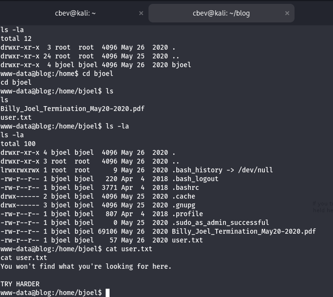 Now with an actual bash shell, I can use commands like find/locate to get around easier. Displaying user.txt under bjoel’s home directory shows that we need to find the actual file someplace else.