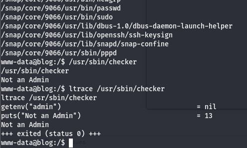 Next, I check the usual routes for privesc and find a special binary with the SUID bit set on it. /usr/bin/checker displays whether we are an admin or not by getting an environment variable and outputting the current user’s status.