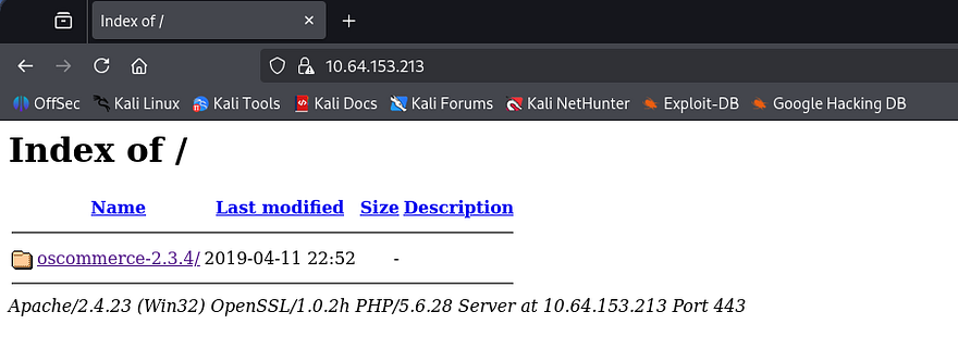 Next up is HTTPS, which discloses that the server is using OsCommerce v2.3.4 to host items on their platform. This port doesn’t hold a real webpage but does give us access to this service’s folder.