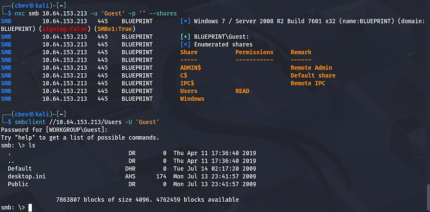 |_nbstat: NetBIOS name: BLUEPRINT, NetBIOS user: <unknown>, NetBIOS MAC: 0a:ff:d0:52:56:45 (unknown)