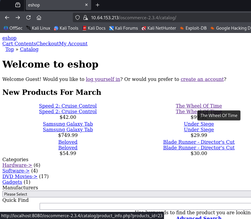This looks like the standard folder and there isn’t much in here for us. Heading back to the sites OsCommerce directory reveals that whenever we hover over one of the products, the page redirects us to a page that uses the products_id parameter to fetch content from the MySQL database. Note that these links only point to localhost, so we’ll have to replace that with the box’s IP address in order to reach them.