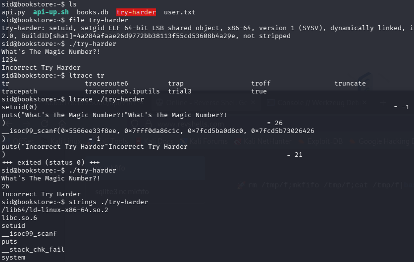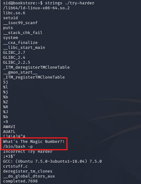 I run ltrace and strace against it but don’t find much, however looking at its strings most likely shows that if we get the magic number right, it drops us into a root Bash shell.