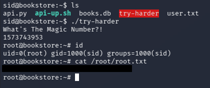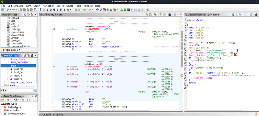 From there, any pair of values for local_1c and local_18 that XOR to that final constant will satisfy the check and execute /bin/bash -p (which spawns a shell preserving root privileges). Since we have both values for local_14 and local_18 we can plug them into the equation via Python in our CLI.