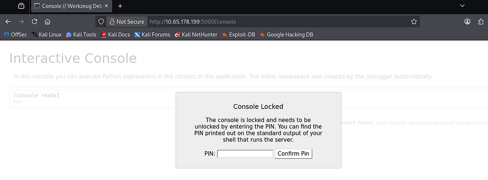 This console page is protected by a PIN that we can get from various places, however we’d need to have shell access or be able to read certain files on the system.