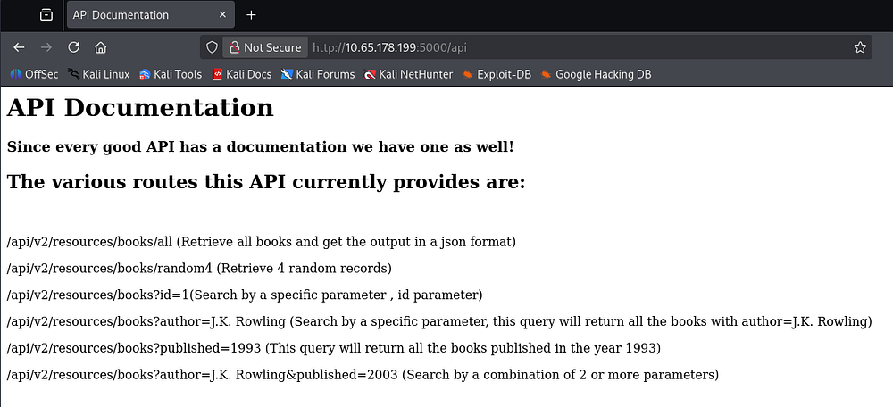Navigating to the /api endpoint, we’re given documentation for the API routes in place for the bookstore.