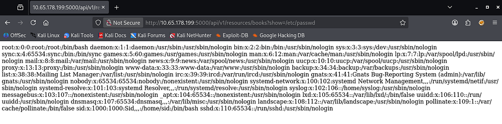 Repeating the process for v1 APIs gives us an interesting endpoint named ‘show’. This is pretty vague but while trying to read files on the system, I get a successful response containing the contents of /etc/passwd.