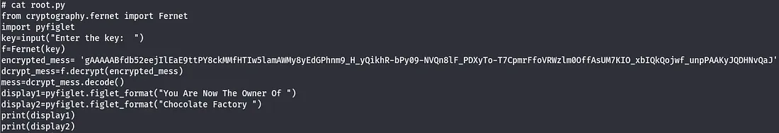 Executing this let’s us list /root directory and find that there is a python script instead of the usual text file as the last flag.