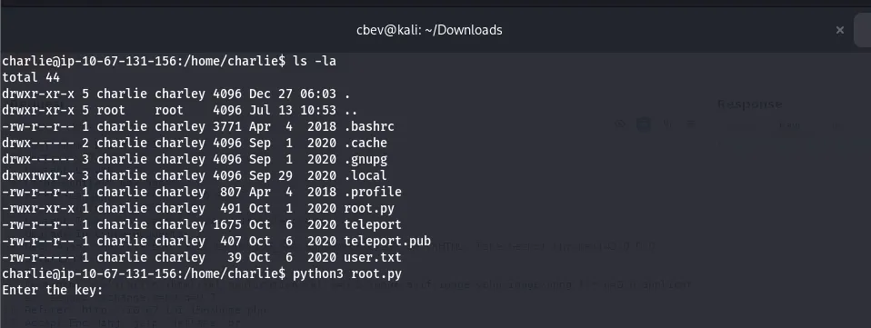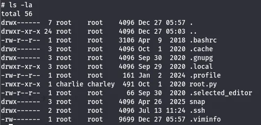 The root.py is also owned by charlie so we can execute it either way, but I chose to move it to charlie’s home directory.