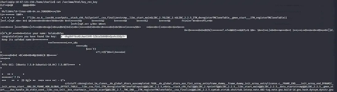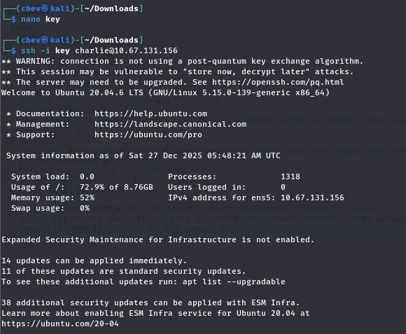 There’s an SSH private key in Charlie’s home directory that we can use to get a nicer shell on the box as well as grab the user.txt flag. Be sure to chmod 700 the key file.