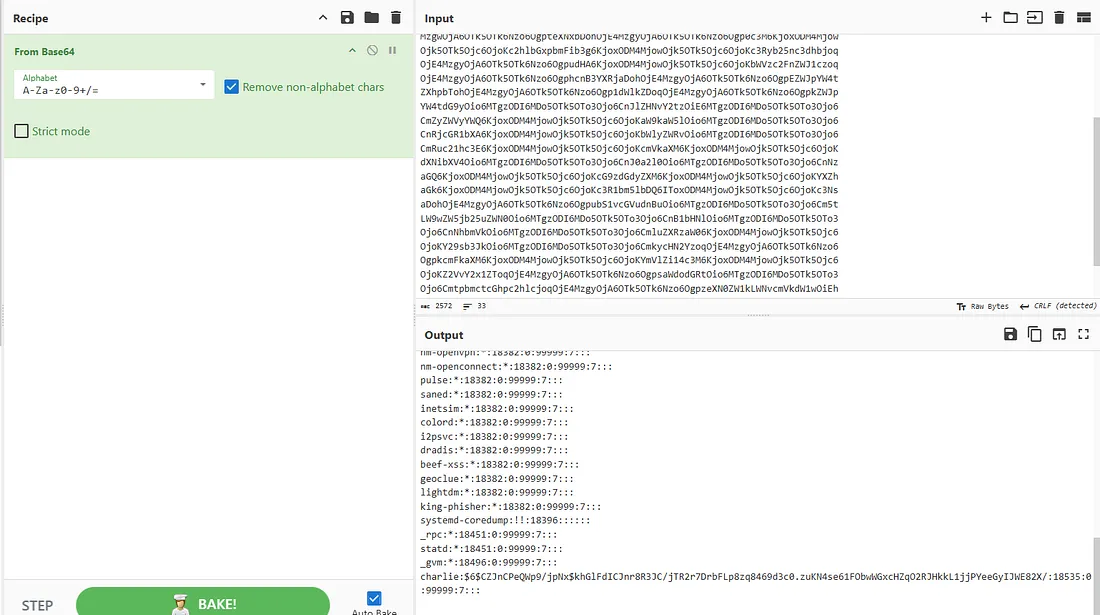 This gives us a text file but it’s base64 encoded so let’s send it over to CyberChef.