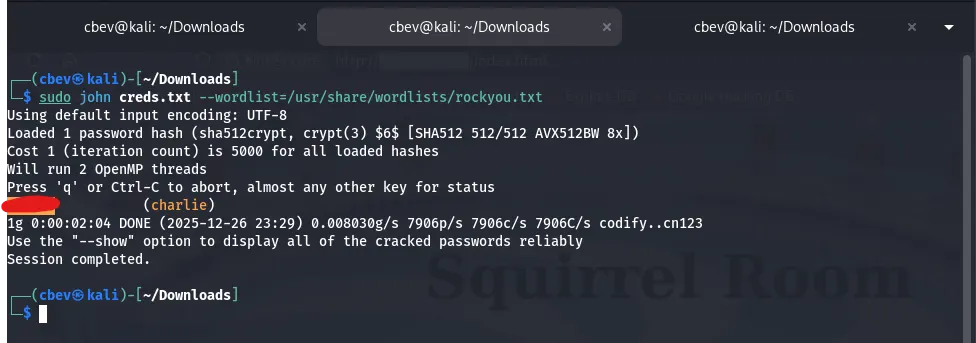 We get a copy of /etc/shadow , the only user with a hash is charlie so let’s crack it with JohnTheRipper.
