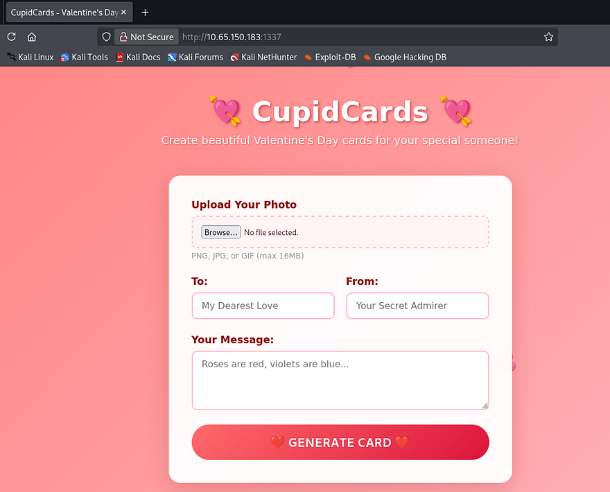 Checking out the landing page shows an upload form where we can select images in order to create a custom valentine’s card. There are also a few text fields which may be prone to some dangerous vulnerabilities.