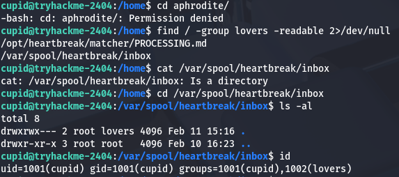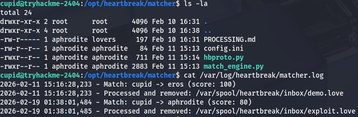 So in order to exploit this we need to create a malicious file ending in .love and have the notes field contain our serialized payload which will be executed. I vibecode a quick script that will echo the private key gathered from earlier into Aphrodite’s authorized_keys file so we’re able to SSH onto the box as her. I should note that we need to refer to the /opt/heartbreak/matcher/PROCESSING.md file in order to meet all format requirements as well.