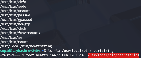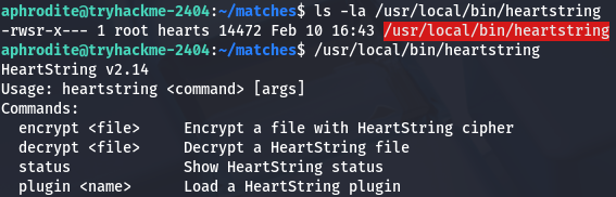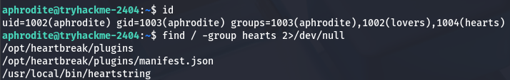 Now we can move to escalating privileges to root user via that heartstring binary found earlier. Checking our privileges, it seems that we are apart of the hearts group and can also write to the plugins’ manifest.json file.