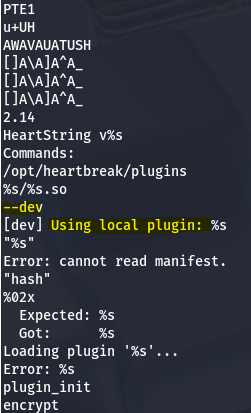 Whilst using the Strings utility on the binary, I find this --dev flag which looks to be used in order to load local plugins.