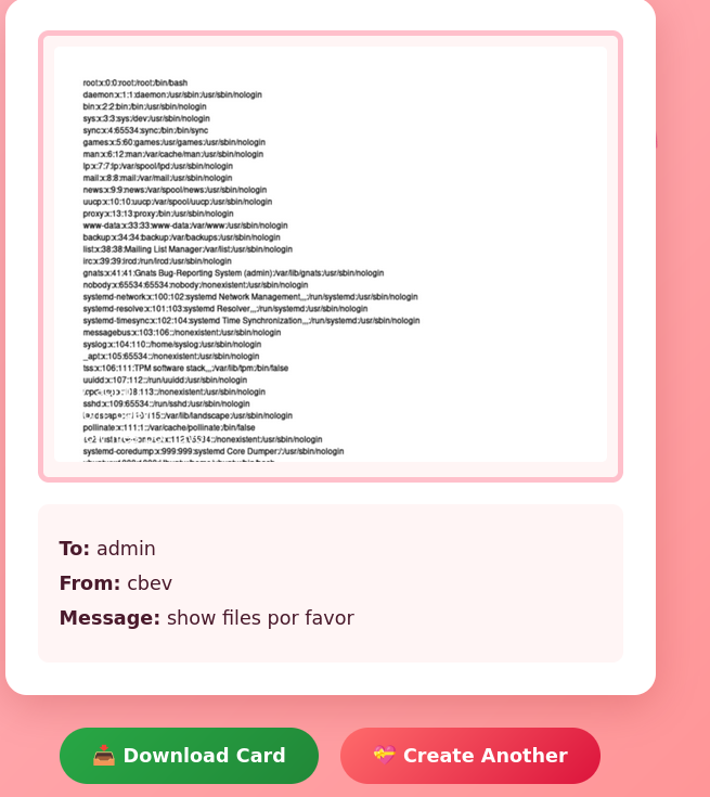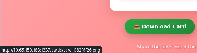 Hovering the download button shows that we’re able to retrieve files from the /cards/ directory upon creation, however the string appended seems randomly generated so we probably won’t have any luck with an IDOR vulnerability there.