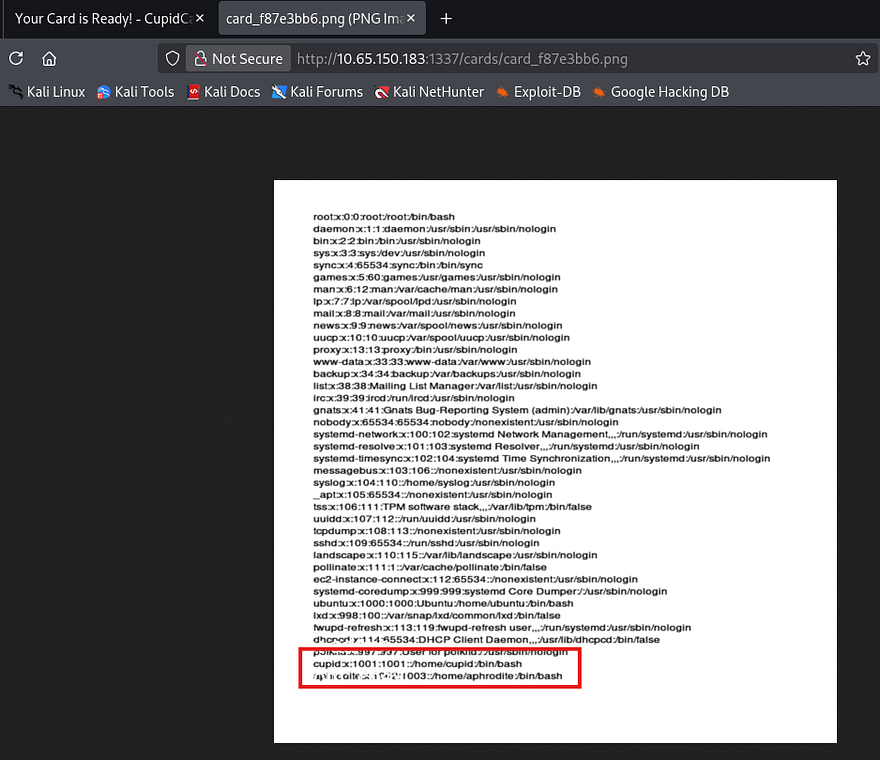 Zooming in to parse the output shows that besides root, there are two other users on the box named Cupid and Aphrodite. I repeat the same process to read the source code under app.py, however this really just discloses how the cards are generated and what characters are being filtered. Since we know valid usernames on the box, maybe one of them has a readable SSH key we can use to login with.