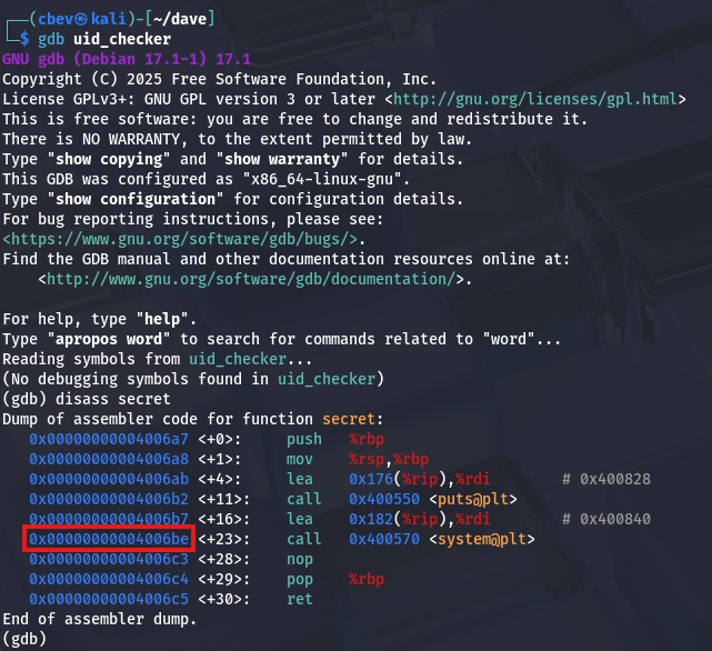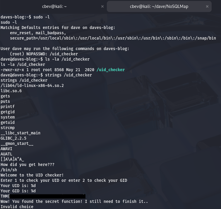 Listing Dave’s sudo privileges shows that he can run a custom binary named /uid_checker as root. Using strings on it gives us the fourth flag and some more great info.