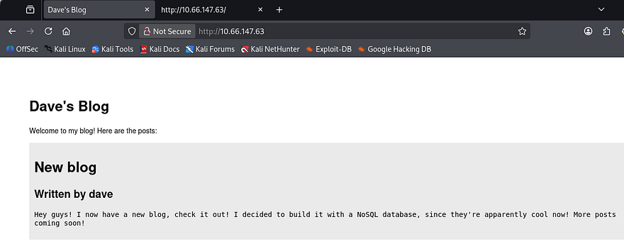 The first landing page shows a barren site where Dave hosts his blog posts. He discloses that he built it with NoSQL which saves us time figuring that out. NoSQL is often prone to some pretty dangerous things like injection attacks to get passwords, including regex exploits.