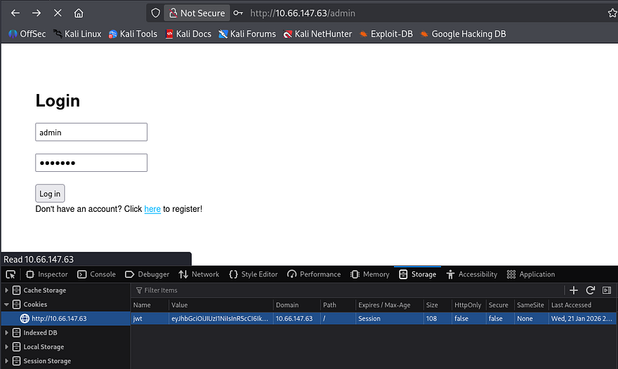 The /admin page holds a simple panel and a function to register, however that is disabled for now. We are also assigned a JWT cookie when landing on the page.
