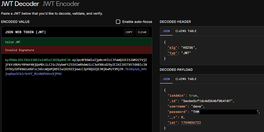 After capturing a request to the login, I test injection for users admin and dave. Using the $ne operator set to null for the password works and we get a login. Decoding the JWT will give us the first flag and we can look around the site.