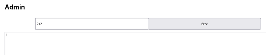 The only thing we have access to internally is to some type of command prompt. I test for functionality with a simple equation of 2+2 and it returns. Supplying exec.exec shows undefined, meaning we’re able to execute that function.