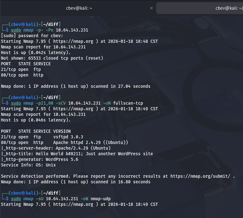Let’s kick things off with an Nmap scan to find all running services for the given IP. I scan common UDP ports as well but get nothing returned.