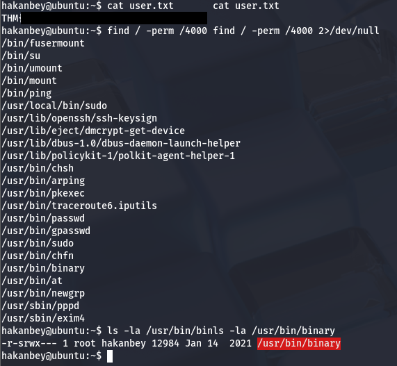 We can grab the user flag under hakan’s home directory at this point. I come across an interesting binary owned by root when searching for files with an SUID bit set.