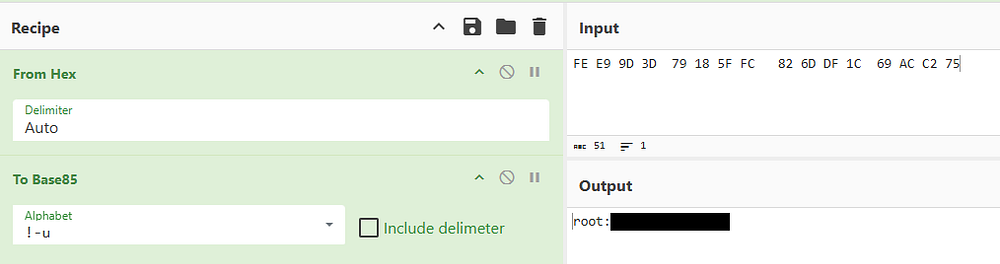 Looking back at the binary output, there’s a hint saying “Hexeditor 00000020 => ????”. After a while of messing around with it in CyberChef, I find the correct recipe is: From Hex -> To Base 85