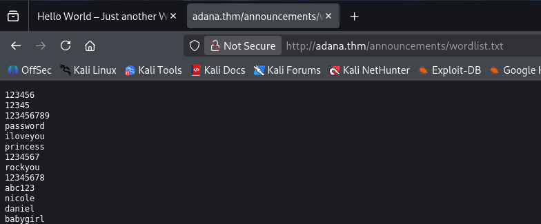 There looks to be an ‘announcements’ directory exposed to us, inside is a wordlist of what looks like passwords as well as an ant.jpg. I use wget to download both files and start enumerating the WP site.