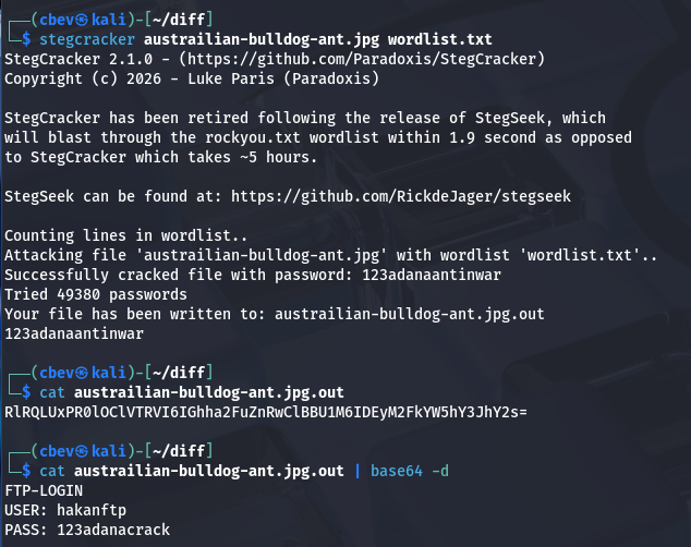 That returned nothing so I turned to Stegcracker to extract hidden data on the ant.jpg using the same wordlist.