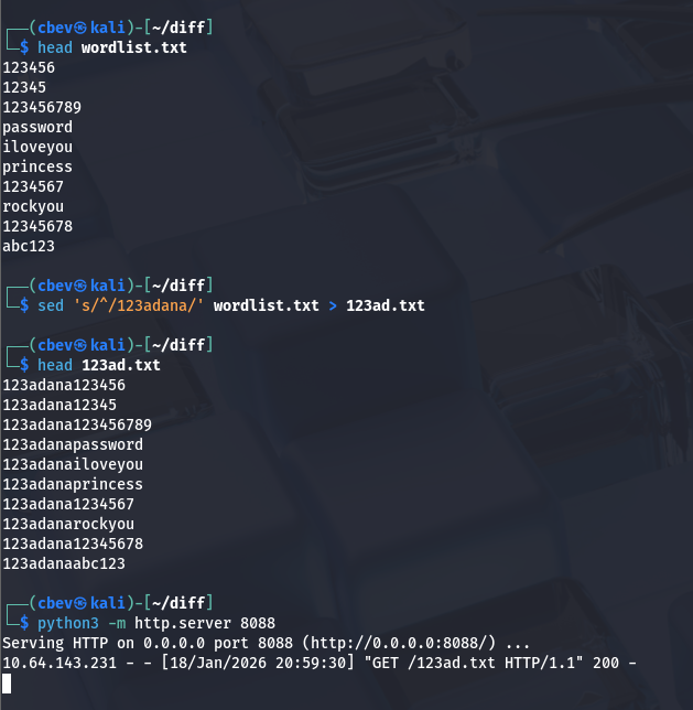 After uploading both sucrack and the wordlist from /announcements/ to /tmp, I get nothing. I thought back to all the other passwords and noticed they all contain 123adana at the beginning, so I prepend that string to all lines in the list and rerun sucrack.