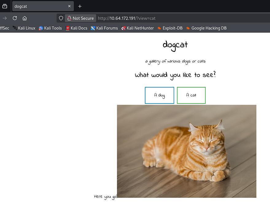 Not a whole lot we can do over SSH without credentials, so I fire up Gobuster to find subdirectories/subdomains in the background before heading over to the website. Checking out the landing page gives us the option to choose between seeing pictures of dogs or cats.