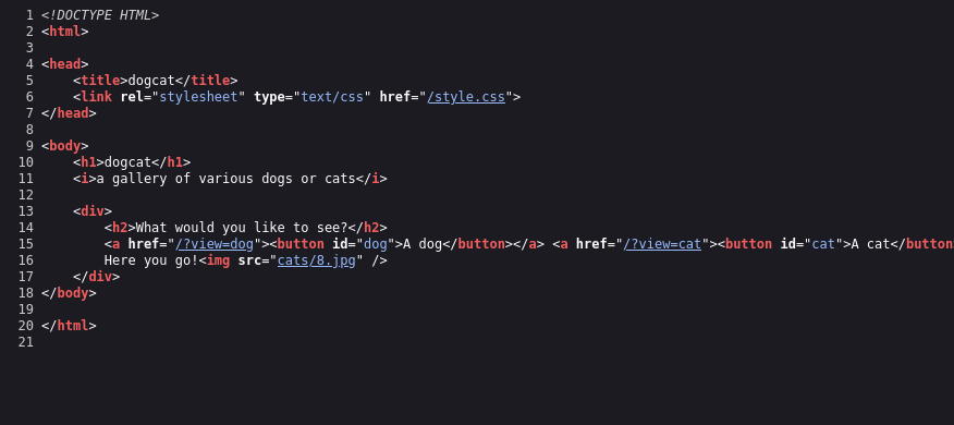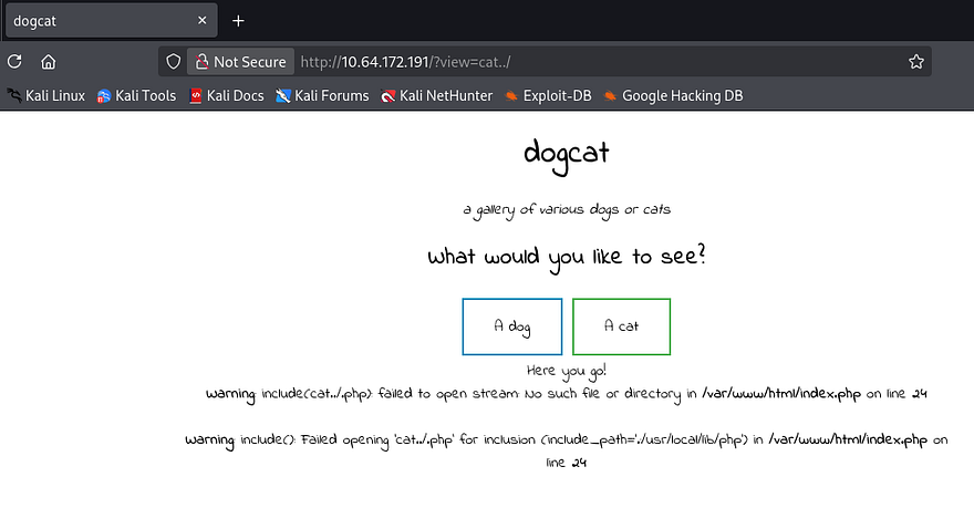Looking at the source code for a valid request shows that our query is most likely inside of either the /dogs or /cats directory. Our full path should be /var/www/html/cats/[INPUT] .