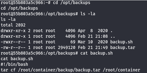 While doing internal enumeration on it earlier, I found a backups directory under /opt which was owned by root. Inside is a Bash backup script that creates a tar backup of the container to the current directory.